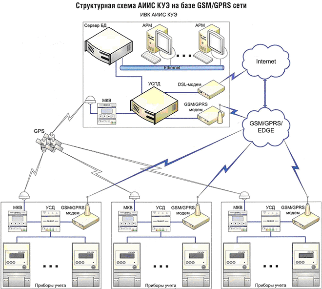 В случаях со значительной топологической удаленностью точек учета предусмотрен вариант построения комплекса АИИС КУЭ (АИИС ТУЭ) на базе GSM/GPRS сети: