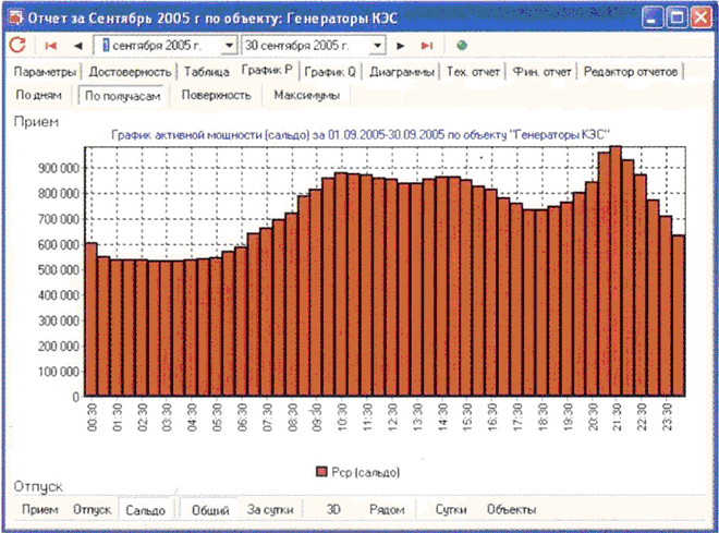 В режиме оперативного контроля программное обеспечение "Alpha++ 2000" обеспечивает контроль максимума нагрузки, оперативный прогноз средней мощности на 30-минутном интервале и при необходимости сигнализацию превышения заявленной мощности. В режиме ретроспективного анализа обеспечивается просмотр накопленных данных по учету электроэнергии и оперативному контролю. В первом случае производится формирование суточной отчетности по электропотреблению, включая получасовые графики нагрузки и отчет режимного дня. Кроме того, можно получить отчет по заданному периоду времени. Ретроспективный анализ оперативного контроля позволяет оценить на основе графиков нагрузки эффективность мероприятий по управлению нагрузкой, выполнить прогноз заявленной мощности.