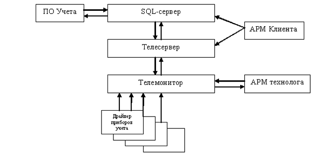 - программное обеспечение сбора данных с цифровых приборов учета. Включает в себя: базовый набор драйверов низшего уровня системы, необходимый для приема информации от цифровых измерительных приборов, размещенных в точках учета, сервер телемеханики, необходимый для конфигурирования каналов связи и объектов учета, формирование отчетов о сеансах связи и др.