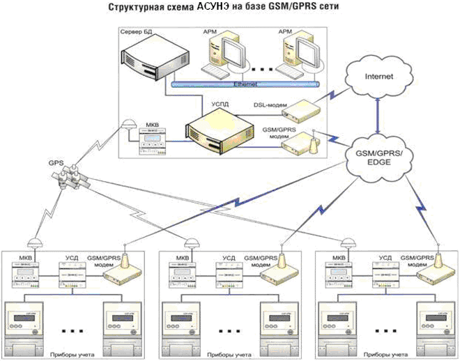 В случаях со значительной топологической удаленностью точек учета предусмотрен вариант построения комплекса АСУНЭ на базе GSM/GPRS сети: