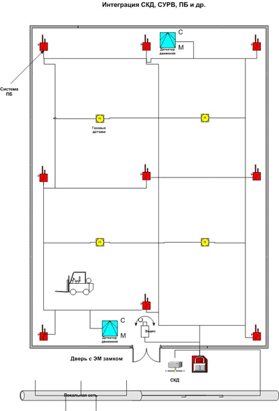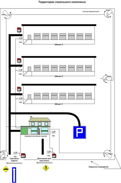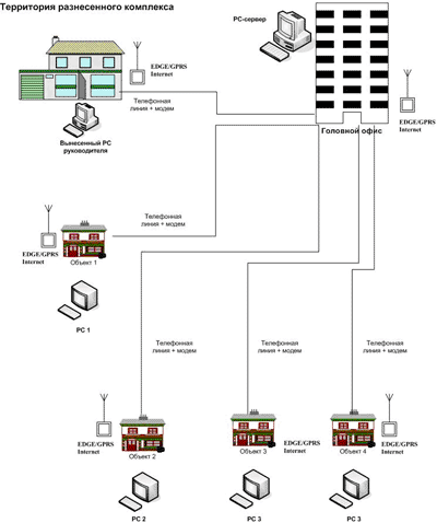 Возможность использования модемной или GPRS-связи позволяют организовывать единый комплекс СКД-СУРВ на комплексах, объекты которого географически разнесены друг от друга (например, здания ведомственного подчинения на территории определенного района города и др.):